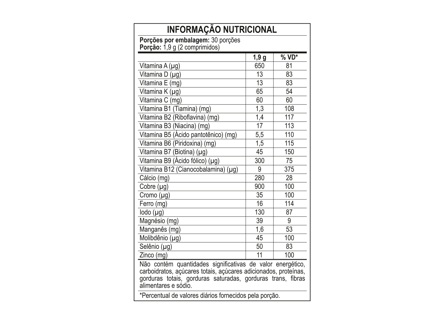 | Componentes | Cálcio, Cobre, Cromo, Ferro, Iodo, Magnésio, Manganês, Molibdênio, Selênio, Zinco, Vitaminas A, D3, E, K1, C, B1, B2, B3, B5, B6, B7, B9 e B12. |