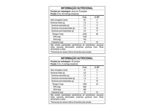 | Componentes | Ômega 3: Ácido eicosapentaenoico (EPA) e Ácido docosaexaenoico (DHA). |